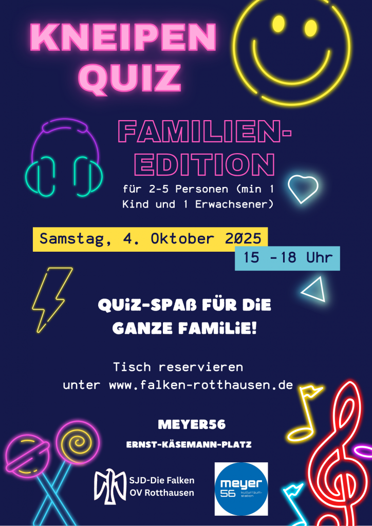 Das berühmte Kneipen-Quiz goes Family. Mit Fragen für Kinder und Erwachsene wird das Kneipen-Quiz zum Familien-Event. Reserviert mit eurer Familie einen Tisch.